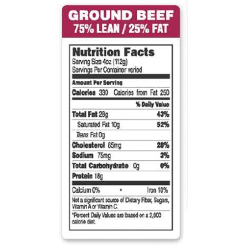 x 3" Ground Beef 75% Lean/25% Fat Meat Nutrition Label