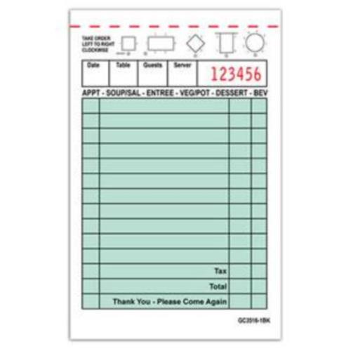 x 5.5" Green 1 Part Booked 14 Line Paper Guest Check. Part of Ace Pak's general selection within food packaging. Commercial-grade supply stocked for the packaging & shipping catalog.