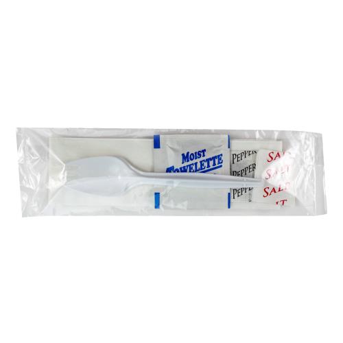 CUTLERY KIT MED/WT P/S SPORK/WETNAP/13X13 NAP S&P. Part of Ace Pak's general selection within food packaging. Commercial-grade supply stocked for the packaging & shipping catalog.