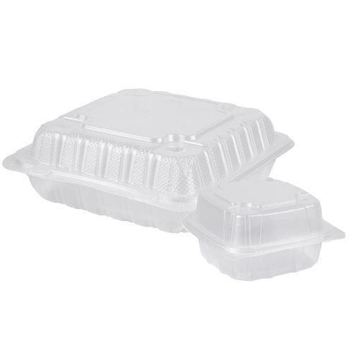 EcoSystems Polypropylene 3-Compartment Hinged Container, Clear, 8.35" x 8.3" x 3". Part of Ace Pak's general selection within food packaging. Commercial-grade supply stocked for the packaging & shipping catalog.