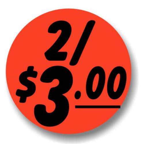 Fluorescent Red Bullseye 2/$3.00 Promotional Label, 1.25"