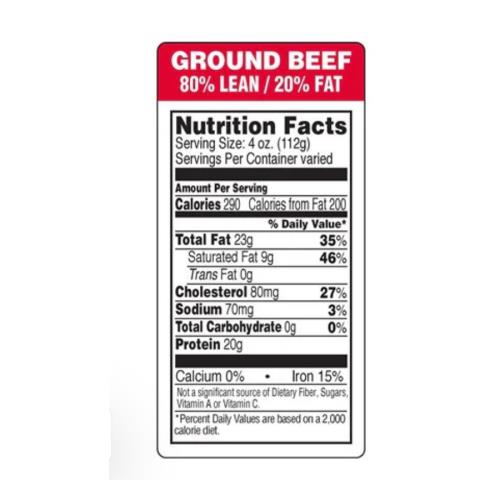 Ground Pork Nutrition Label, 80% Lean / 20% Fat, Red/Black/UV, 1.5" x 4.125"