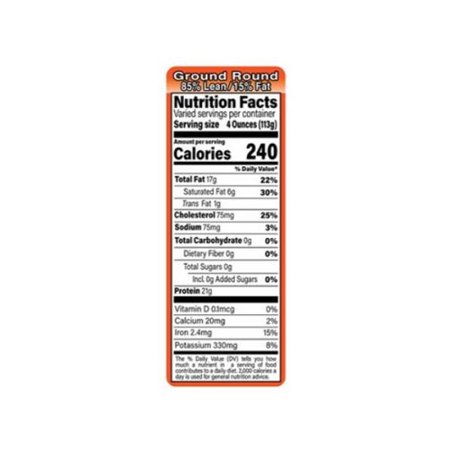 Ground Round 85% Lean / 15% Fat Label, Orange/Black/UV, 1.5" x 4.13"